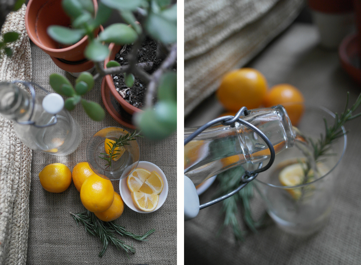 These days I start my morning with a simple glass of lemon water with a sprig of rosemary. It seems so simple and yet the slightly sweet meyer lemon and the aromatic rosemary take the senses away and calm the mind.